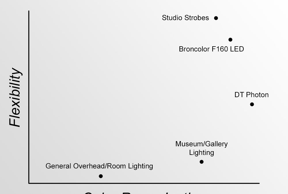 Sometimes strobes may not be the clear choice after considering price, parts & maintenance, or operator comfort (i.e. eye fatigue). Therefore, we should consider where two different continuous light sources fit into the equation: The DT Photon series and the Broncolor LED F160.