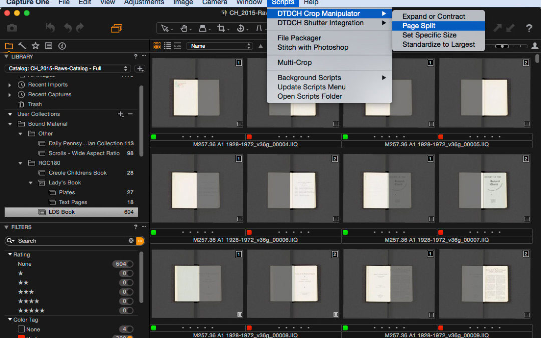 • Page Split: When using the DT RGC180 to image two-up facing pages of bound material the AutoCrop tool’s Book Scanning mode does a great job of cropping the frame to the page-spread. For those clients that would like a crop for each of the two pages this tool does the rest. Give it a selection of page-spread raws and it will create a variant cropped to the left page and a variant cropped to the right page. It will even color tag the left pages green and the right pages red, so that it’s easy to filter the view to just one side at a time. A user-settable margin can be set to include more or less of the gutter or adjoining page.