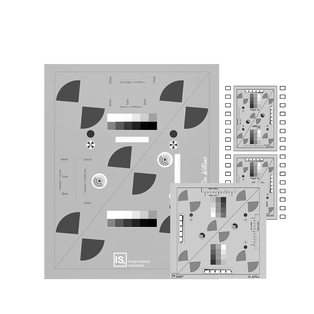 These are very high resolution B&W silver halide film targets for verifying Resolution, MTF or SFR, tonescale and white balance of digital cameras and scanners. They are especially popular for verifying image quality for copy stand film or glass plate digitization using digital cameras. They are available in standard 35mm, 6 cm (120), and 4″ x 5″ formats. Features include: